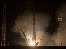 A long day, indeed. Vinogradov, Misurkin, and Cassidy were helped into their Sokol launch-and-entry suits about four hours ahead of today’s liftoff and were in their specially-contoured seats aboard the Soyuz TMA-08M descent module approximately two hours later. In those final hours, their launch vehicle—a descendent of Sergei Korolev’s R-7 rocket, an early version of which carried Yuri Gagarin into space—underwent its final checks, culminating in the completion of fueling and the implemention of the flight program software. At one stage, Jon Bon Jovi’s song “It’s My Life” was piped into the Soyuz cabin. Ten minutes before launch, the three men were instructed to close their visors. A minute before liftoff, the rocket was transferred to internal power supplies, and at T-10 seconds the engine turbopumps reached full speed. By five seconds, the engines themselves had reached maximum thrust, leading to the retraction of the launch pad’s fueling tower and an on-time liftoff into the darkened Baikonur sky.