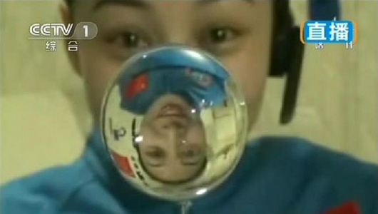 Nie, Zhang, and Wang successfully docked with Tiangong-1 at 5:11 a.m. UTC on 13 June and hatches between the spacecraft and the orbital laboratory were opened around three hours later. During the early stages of their mission, the taikonauts replaced part of the laboratory’s interior cladding, marking the first instance of orbital maintenance aboard a Chinese spacecraft, and on 20 June Wang delivered a 41-minute video lecture to schoolchildren. She demonstrated the peculiarities of the microgravity environment, using her crewmates, a floating “ball” of water, and a spinning top as aids.
