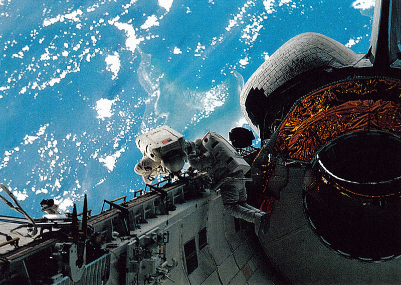 Working through their tasks, Walz and Newman—who were both first-time astronauts, as well as first-time spacewalkers—found that operating in the microgravity environment, suited, was far easier than it had been in the Weightless Environment Training Facility (WETF) water tank at the Johnson Space Center (JSC) in Houston, Texas. An attempt to use the power tool in a high-torque evaluation was slightly delayed by a low-battery warning, which prompted Newman to return to the airlock for a spare, and the men opined that the mini work stations on the RMS offered “very little restraint for the torque operations.” Later, Newman evaluated a portable foot restraint for the Hubble mission and found that it was much harder to egress the device than it had been in ground simulations. The astronauts returned to the airlock after seven hours and five minutes outside. In their post-flight debriefing, Walz and Newman stressed the importance of thermal vacuum chamber tests as part of EVA training.