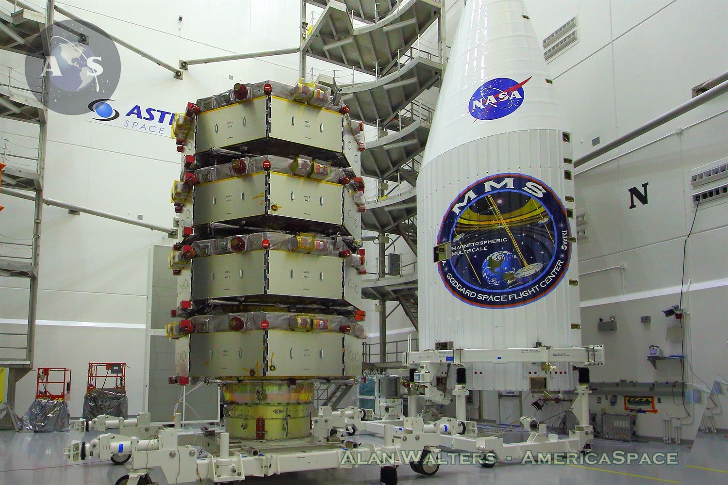 The vehicle commenced formal processing last month, when the Common Core Booster (CCB) of the Atlas V was mounted atop the Mobile Launch Platform (MLP) at SLC-41. Its twin strap-on rockets—manufactured by Aerojet Rocketdyne—were attached to the stack on 7-9 February, followed by the interstage and the Centaur a couple of days later. As described by AmericaSpace’s Talia Landman, the MMS payload was transferred to the pad on 27 February and, ensconced within its Extra-Extended Payload Fairing (XEPF), was mated to the Centaur shortly afterwards. This was followed by the joint NASA-ULA Flight Readiness Review (FRR) on Friday, 6 March, and a Countdown Dress Rehearsal and Launch Readiness Review (LRR) on Monday and Tuesday of this week. Passing through each of these milestones without incident, the Atlas V 421 vehicle was transferred atop the MLP from the Vertical Integration Facility (VIF) to the SLC-41 pad surface on Wednesday.