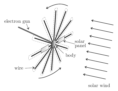 More specifically, the electric sail design consists of a series of 10-20 km-long, ultra-thin slowly rotating tethers that are positively charged. As the positively charged protons of the solar wind collide with the rotating tethers they would be repelled and this exchange of momentum would produce a slight push that would add up with time to a considerable acceleration. Since the solar wind consists of negatively charged electrons as well, the electric sail concept uses an electron gun in order to discharge them and keep the tethers’ positive charge intact.