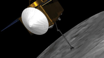 The mission operations begin with launch off a ULA Atlas V rocket on Sept. 8, 2016. It will spend a year in orbit around the Sun before using Earth’s gravitational field to send it on its way to asteroid Bennu. OSIRIS-REx will begin its approach to Bennu in August 2018 and adjust itself to match the velocity of the asteroid. The spacecraft will begin taking a detailed survey of Bennu and continue doing so for about a year. During the survey, OSIRIS-REx will also map out potential sample sites. Once a sample site is chosen, the spacecraft will briefly touch the surface and retrieve a sample. For no longer than 5 seconds, the spacecraft’s sampling arm will make contact with the surface of Bennu and release a burst of nitrogen gas. This disturbance will stir up rocks and surface soil, which will then be captured in the sampler head of the spacecraft. There is enough nitrogen for three sampling attempts and to collect 60–2000 grams (2–70 ounces).