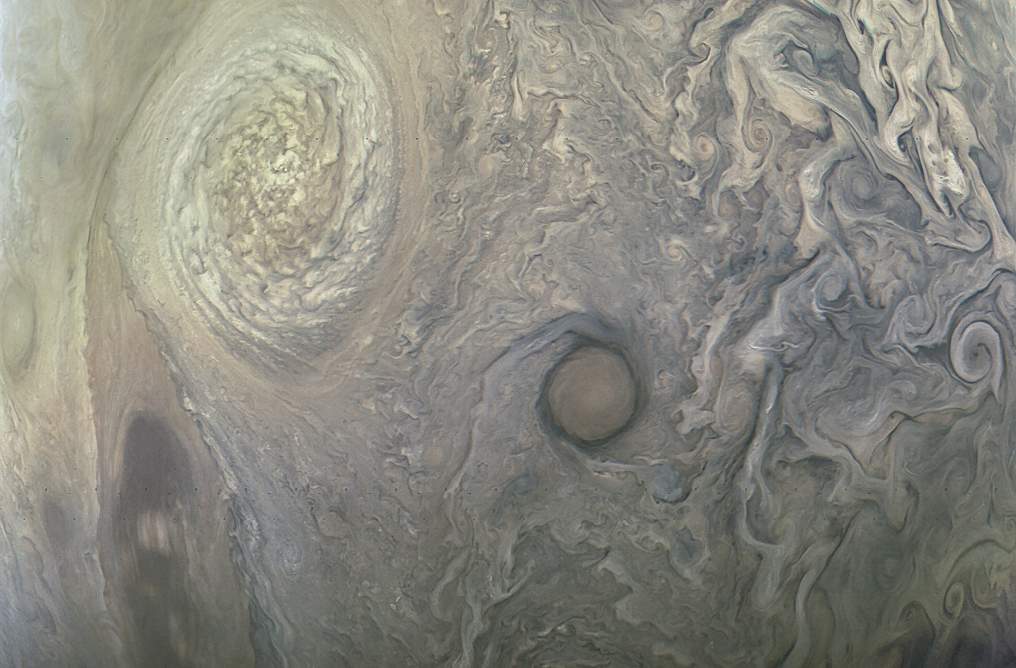 The new images are the closest-ever views of this phenomenon, showing fine detail in the swirls and eddies within the spot. The flyover of the spot was part of Juno’s sixth close flyby of Jupiter, and at its closest, Juno flew only 5,600 miles (9,000 kilometers) above the Great Red Spot cloud tops.