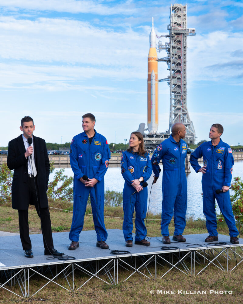 The astronauts watched, shook hands, met with workers and children and spoke to journalists as their rocket and spacecraft moved at 0.8 mph to the launch pad. NASA’s new Administrator, Jared Isaacman, attended and spoke as well.