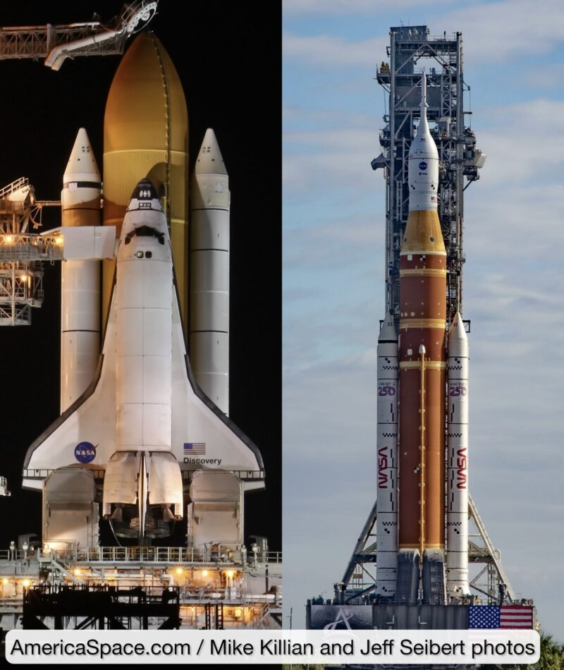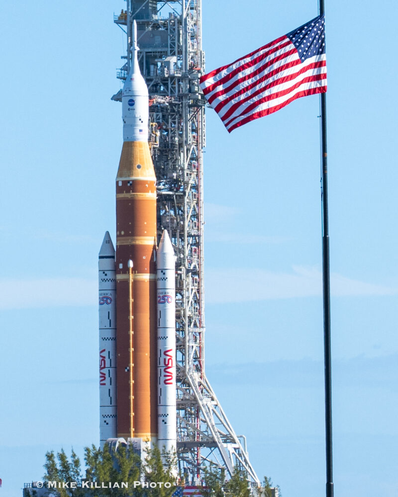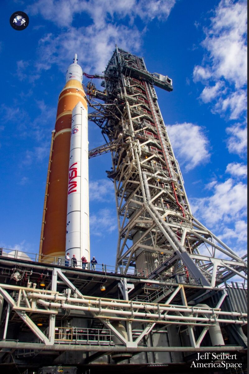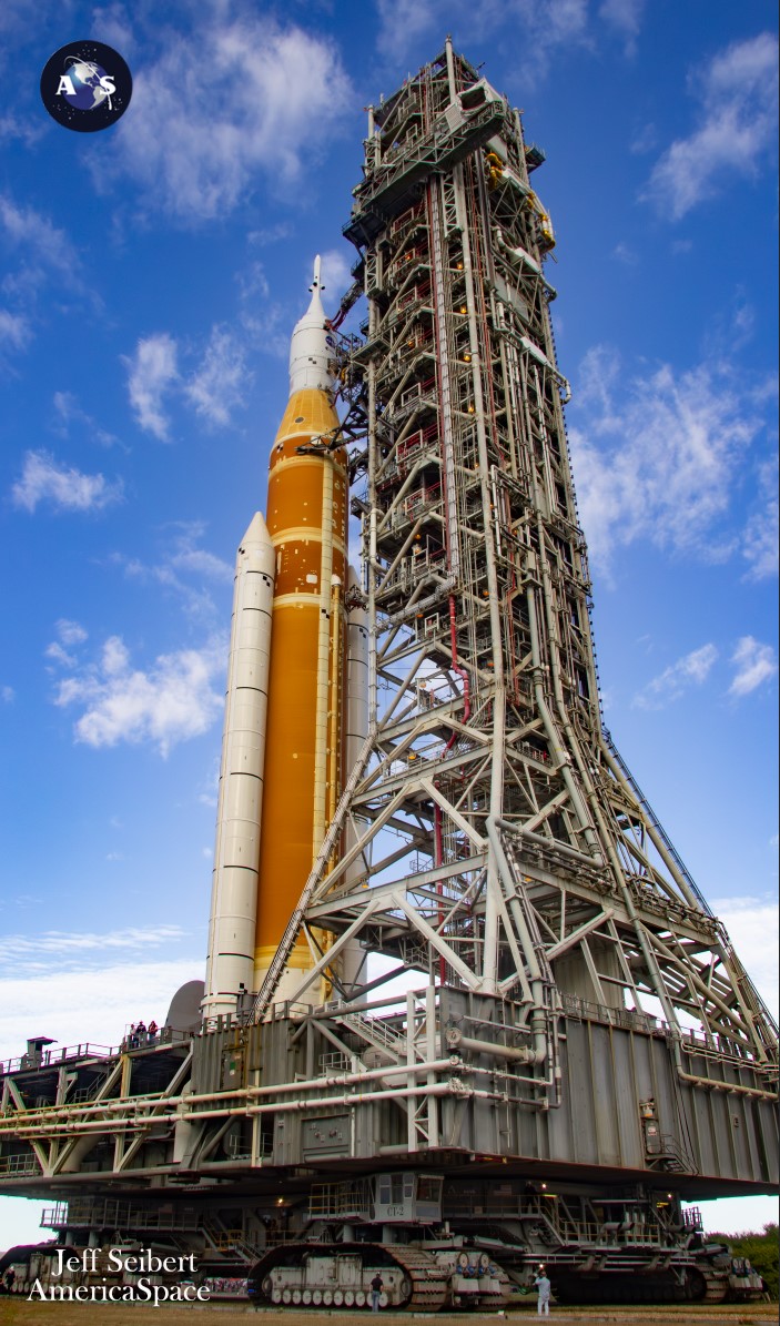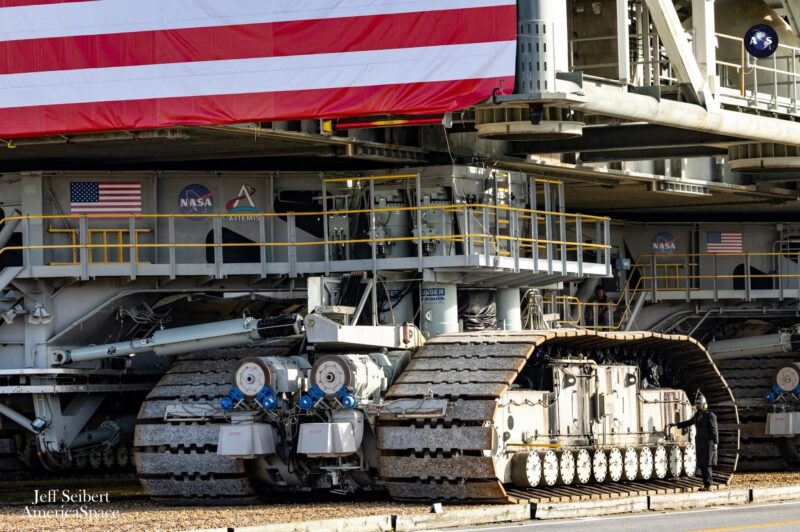 SLS and Orion crawled out attached to a 380-ft tall launch tower, standing on a launch platform and carried by Kennedy’s Crawler Transporter-2 (CT2). Combined, CT2 and the stack weigh over 21 million pounds. The crawler too was originally made to move Apollo, then the space shuttles, and he been upgraded to now carry Artemis.