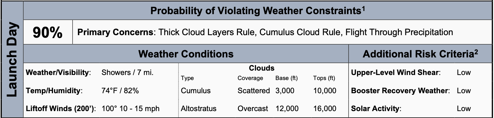 The 45th Weather Squadron are predicting a 90% chance of Launch Commit Criteria being violated today. The Primary Concerns are Thick Cloud Layers Rule, Cumulus Cloud Rule, Flight Through Precipitation