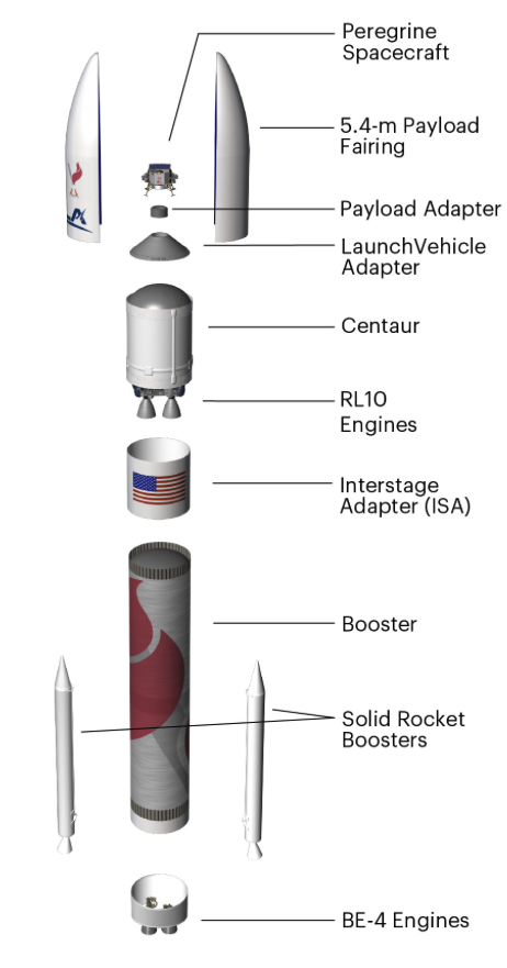 The Vulcan Centaur rocket is a two stage rocket with a pair of strap on solid rocket boosters topped by a Centaur upper stage.