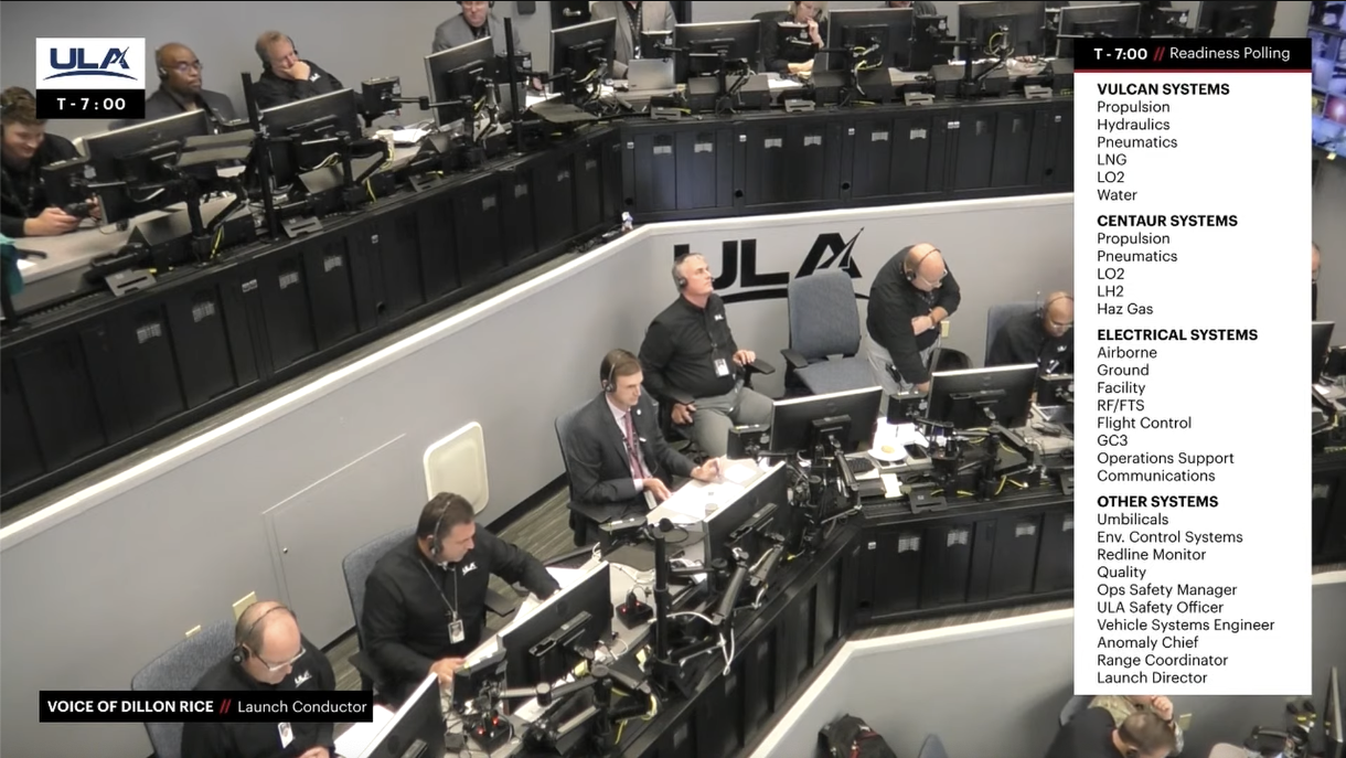 Everything is going to plan with no issues being worked either on the Vulcan Rocket or the Ground Systems. The countdown clock is currently in a planned 60 minute hold at T-7 minutes.