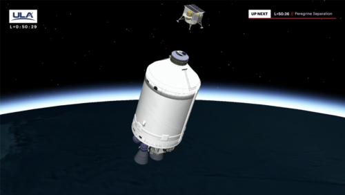 The Peregrine spacecraft has just separated from the Centaur upper stage and is on its way to land on the Moon. In the mean time the Centaur upper stage will continue on a 28 minute coast phase prior to the 3rd burn of the Centaur engines.